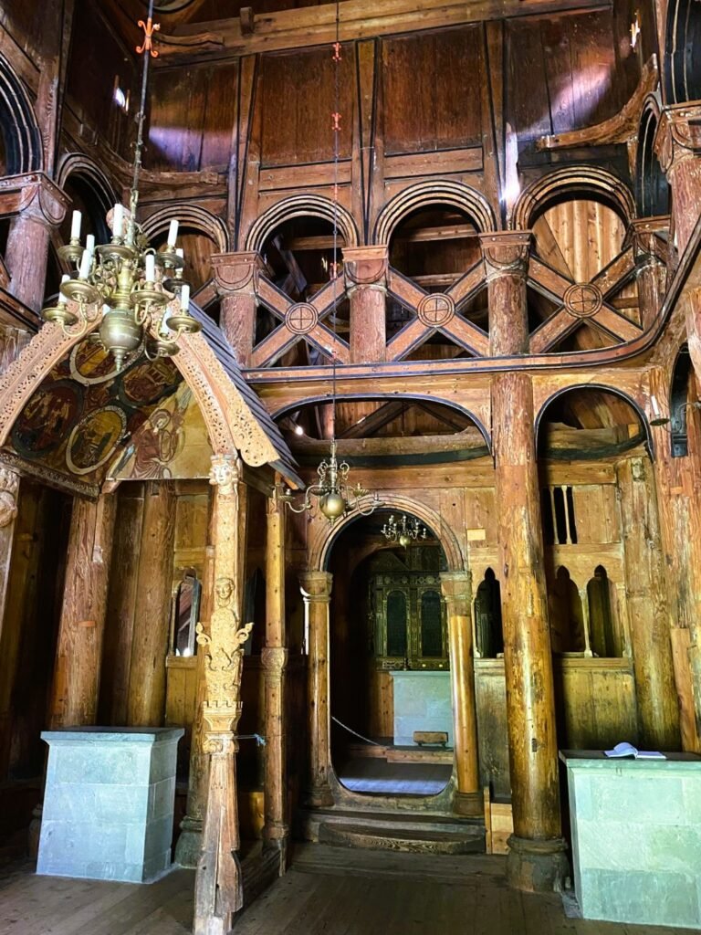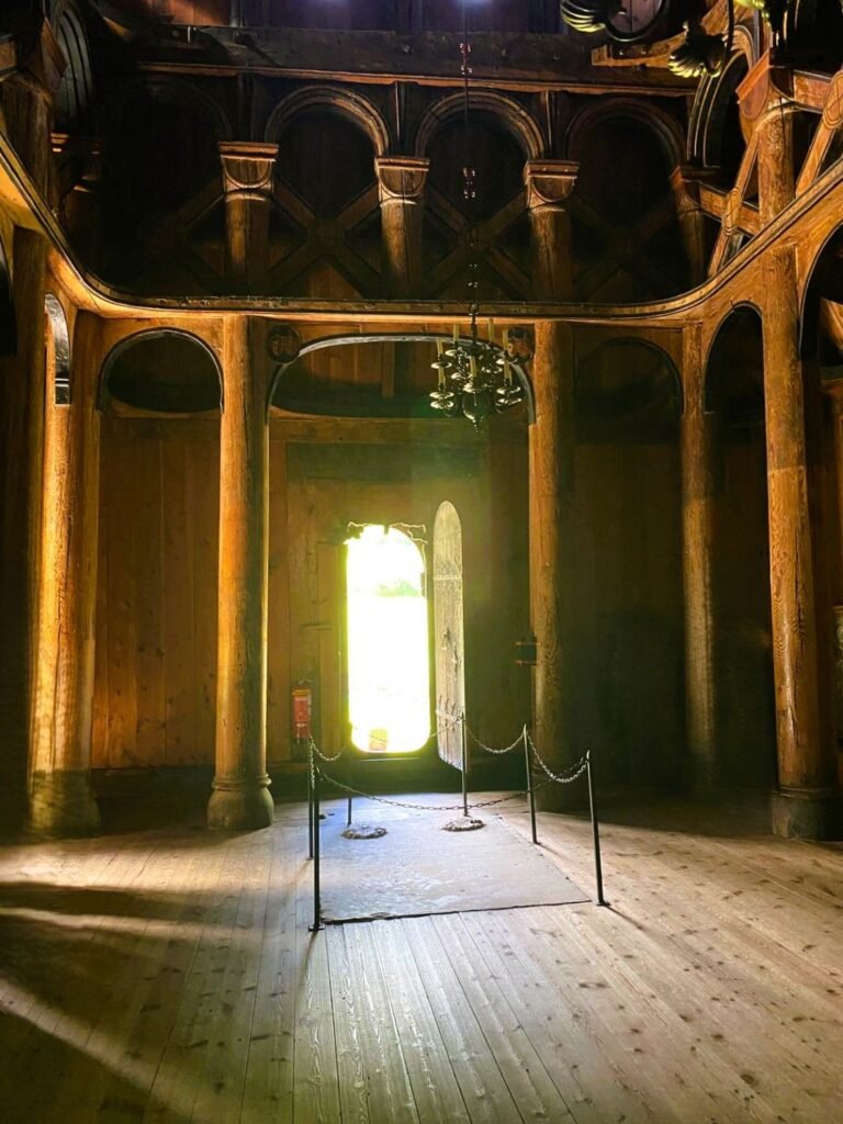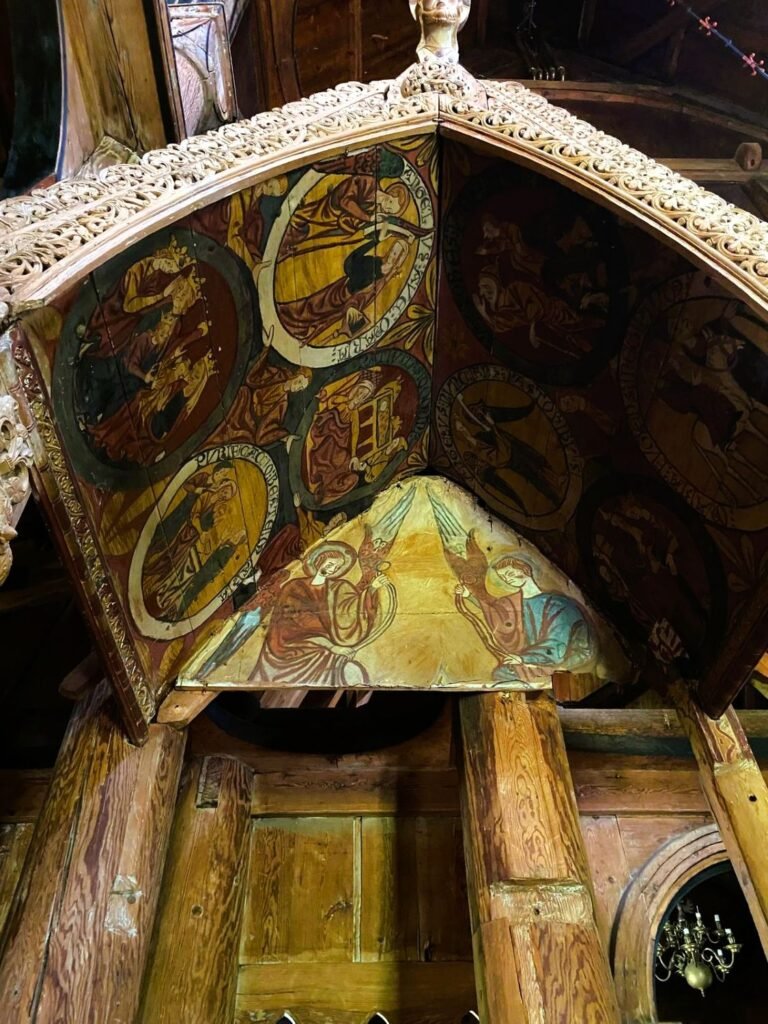 En el interior, si no fuera por el halo de luz que entra por la puerta, prácticamente no se vería nada. No hay ventanas, solo velas: el espacio de culto es muy diferente a lo que solemos encontrar en el resto de Europa. Solo el primer románico es capaz de reproducirme esta sensación de acogimiento, fe y protección. Si por fuera podemos tener la impresión de cierta sistematización en la construcción, por dentro es pura libertad artística: arcos, capiteles, columnas, calados, entrelazados, arabescos y un sinfín de detalles tallados en la madera. Incluso hay pinturas que, durante la rehabilitación del siglo XIX, salieron a la luz, con un estilo muy similar a los inicios del arte gótico.