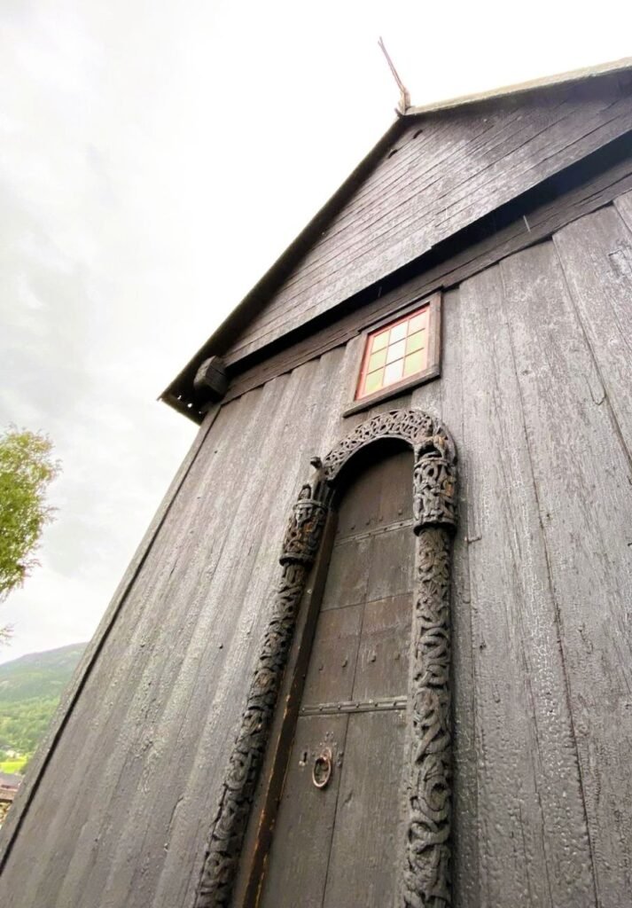 Es una de las pocas iglesias de madera de Noruega que sigue celebrando culto, al ser la principal del pueblo. Su planta es diferente a las anteriores: el acceso se realiza por uno de los laterales y, en los siglos XVII y XVIII, tuvo diversas ampliaciones. Este motivo llevó a debatir la idoneidad de incluirla en el selecto grupo. Aunque exteriormente no hay grandes diferencias, las remodelaciones fueron tempranas y mantuvieron la imagen medieval, a pesar de la obertura de ventanas, otro pequeño inconveniente para los más puntillosos. Un nuevo pez, con escamas, adornado con el dragón y la cruz.