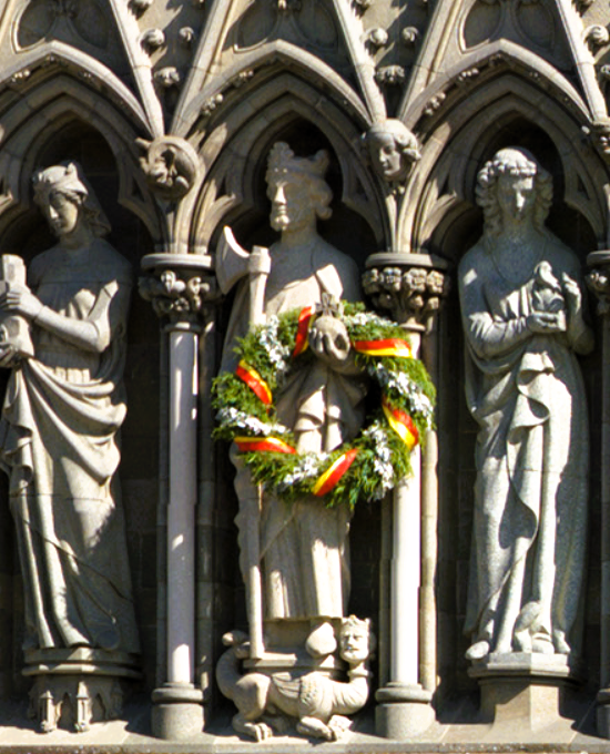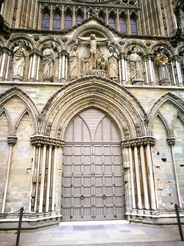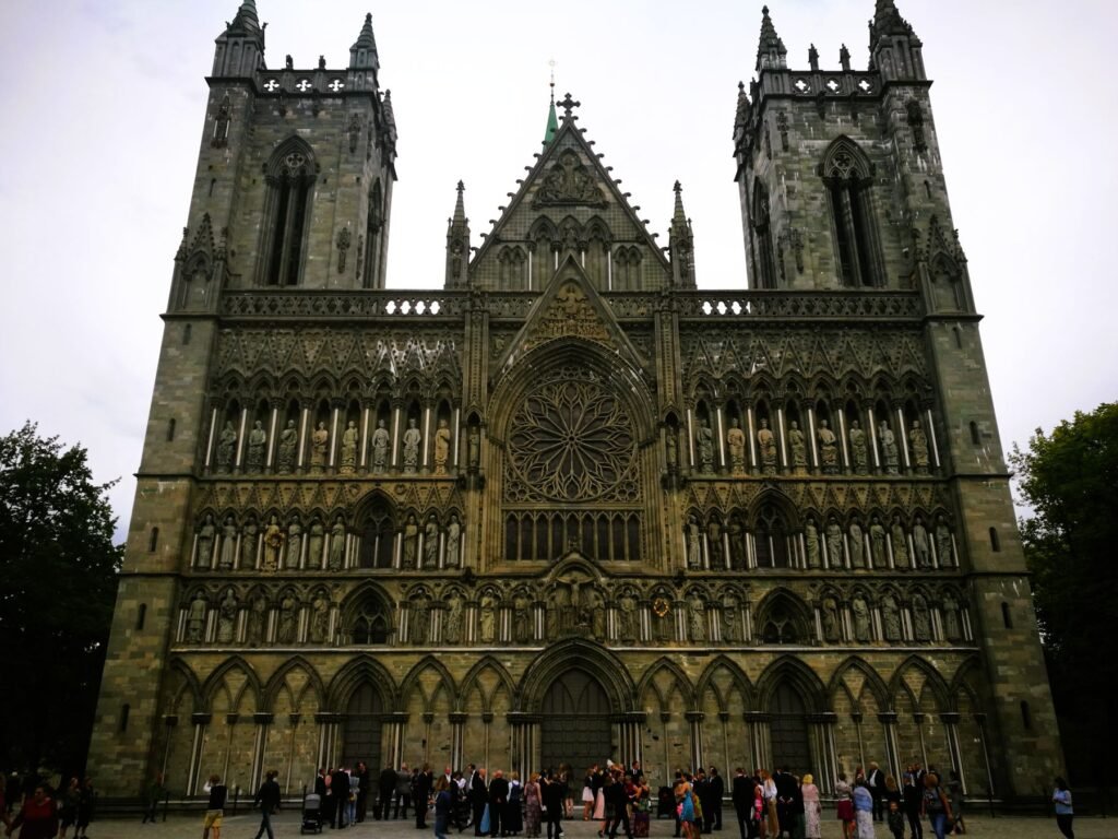 Vuelvo a colocarme enfrente para disfrutar de su magnífica fachada. Sobre el pórtico, a los lados del enorme rosetón, nos saludan más de medio centenar de esculturas. En la parte central, Cristo crucificado; a su derecha, su madre, la Virgen María; a su izquierda, su padre, San José. Pero una destaca por encima de todas al estar adornada: en la fila central, en la cuarta posición desde la izquierda, aparece una figura real, con una gran hacha en su mano derecha y una bola con una cruz en la izquierda. Es San Olaf, uno de los primeros reyes cristianos de Noruega, aunque, como veremos, no el primero. La catedral gótica más septentrional del mundo fue construida entre 1070 y 1300 para acoger la tumba de Olaf II de Noruega, muerto en la batalla de Stiklestad, cerca de la localidad de Verdal, situada al norte de Trondheim. Desde entonces, y hasta hoy, se ha convertido en el principal lugar de peregrinaje de los noruegos.
